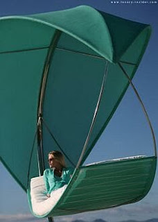 Seu único apoio dá a impressão de flutuação e a tela de cima protege quem estiver deitado nela do sol.